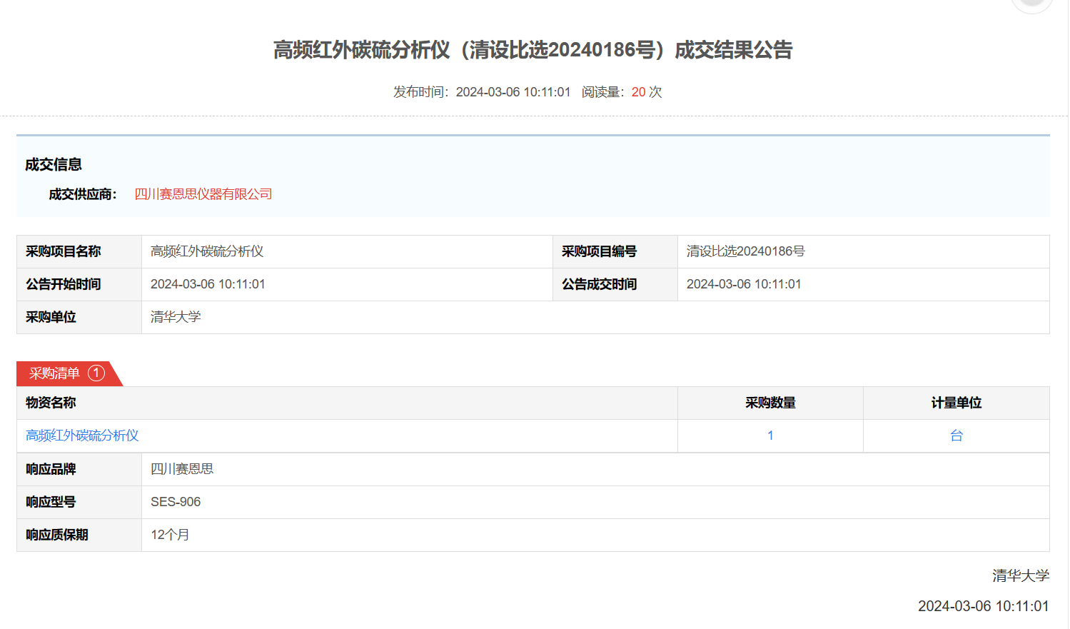 四川赛恩思仪器有限公司参加了清华大学举办的“高频红外碳硫分析仪”比选项目,并成功中标。