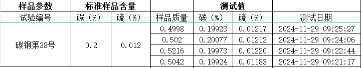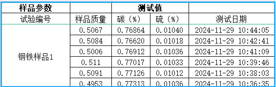 随后,专家们参观了赛恩思高频红外碳硫仪的生产调试过程,重点观看了操作人员如何建立标准曲线、检测重复性和长期稳定性,并实时展示了仪器的测试结果。通过现场演示,专家们对仪器的检测准确性和高效性深感满意。测试数据显示,赛恩思高频红外碳硫仪不仅能够快速、准确地测定样品中的碳、硫含量,而且在长时间运行后依然能保持稳定的性能,完全符合高标准的检测需求。以下为此次样品测试数据: